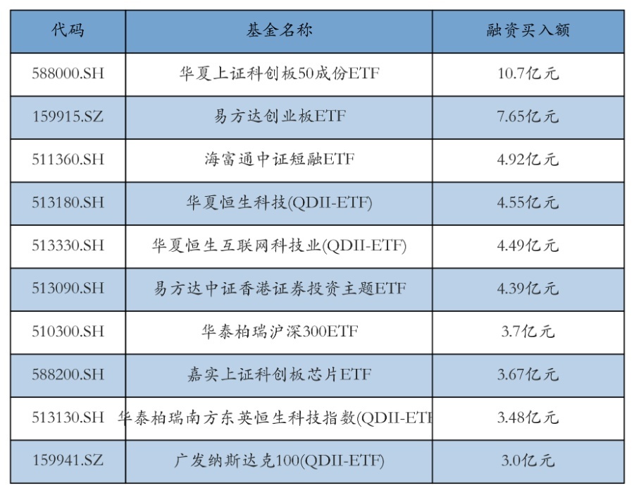 1月8日ETF融资买入额前三位分别为:华夏上证科创板50成份ETF(10.7亿元)、易方达创业板ETF(7.65亿元)和海富通中证短融ETF(4.92亿元),前10具体见下表: