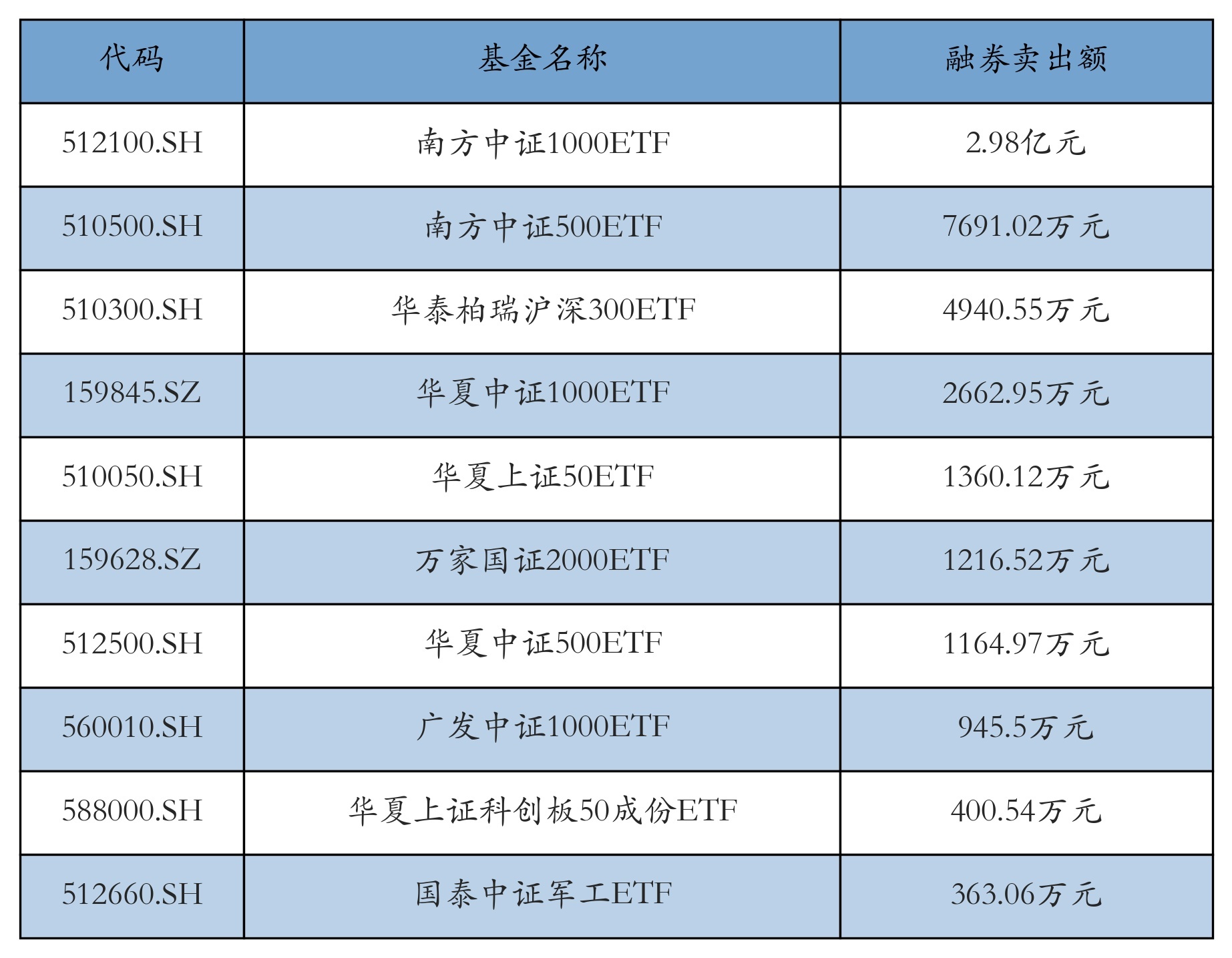 1月8日ETF融券卖出额前三位分别为:南方中证1000ETF(2.98亿元)、南方中证500ETF(7691.02万元)和华泰柏瑞沪深300ETF(4940.55万元),前10具体见下表: