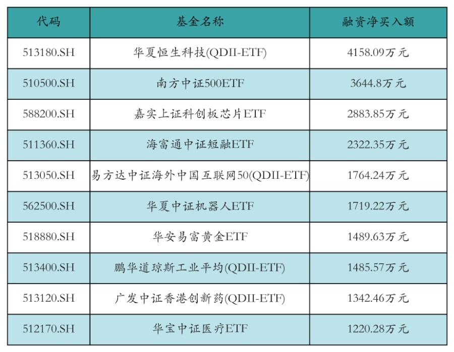 1月8日ETF融资净买入额前三位分别为:华夏恒生科技(QDII-ETF)(4158.09万元)、南方中证500ETF(3644.8万元)和嘉实上证科创板芯片ETF(2883.85万元),前10具体见下表: